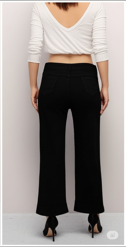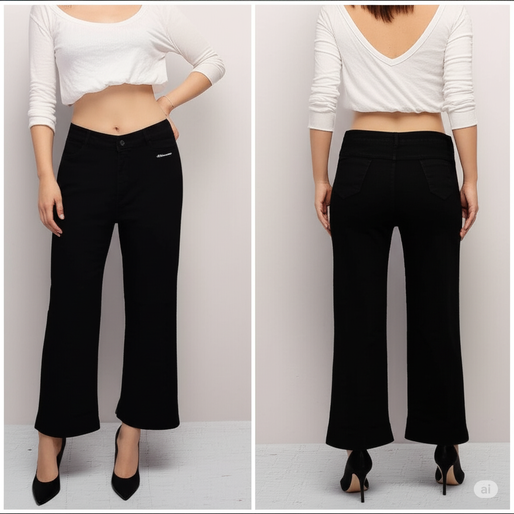 Step out in style with these chic and modern women’s black flared cropped jeans. Featuring a flattering high-waisted fit, these jeans cinch the waist and create a sleek silhouette. The kick flare or cropped flare design adds a trendy twist, ending above the ankle to showcase your footwear, from heels to sneakers.