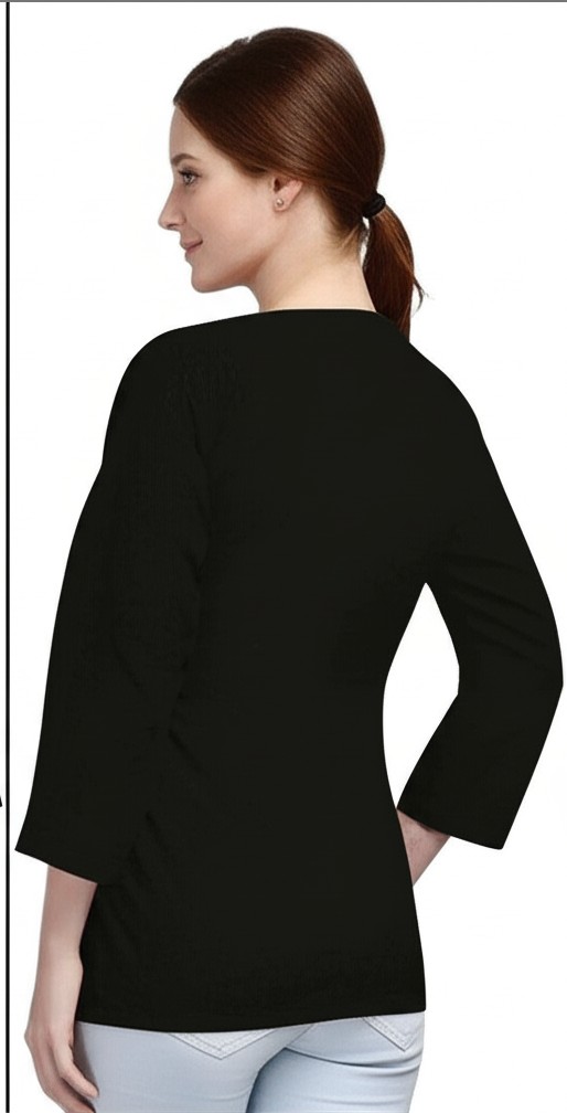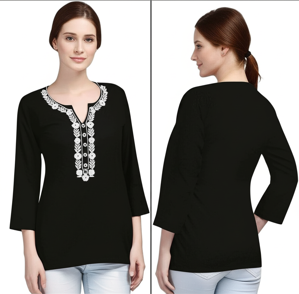 Elevate your everyday style with this chic and comfortable black short kurti. Designed with a timeless V-neck and a flattering short length, this tunic features intricate white floral embroidery on the yoke and placket, adding a touch of traditional elegance. The three-quarter sleeves offer a relaxed fit, making it perfect for both casual outings and semi-formal events. Made from a soft, breathable fabric, it’s an effortless piece to pair with your favorite jeans, leggings, or palazzo pants for a stylish look.