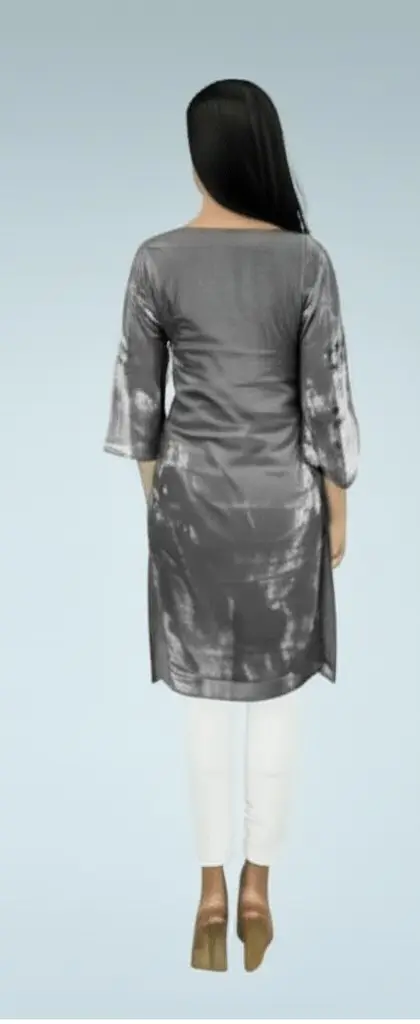 The dark base is beautifully contrasted with a white tie-dye effect, highlighted by intricate white embroidery around the neckline and delicate motifs across the front. The kurti’s flattering long cut and 3/4 sleeves offer a blend of ethnic charm and contemporary design. Pair this versatile piece with white leggings, palazzos, or jeans for an effortlessly chic look suitable for any occasion, from casual outings to office wear.