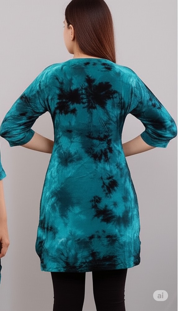 Unleash your free spirit with this stunning Women’s Vibrant Teal Tie-Dye Rayon Kurti. This unique piece seamlessly blends a modern tie-dye aesthetic with classic ethnic embroidery, creating a truly eye-catching look. Crafted from soft, breathable rayon fabric, it ensures comfort and a flattering drape for all-day wear.
