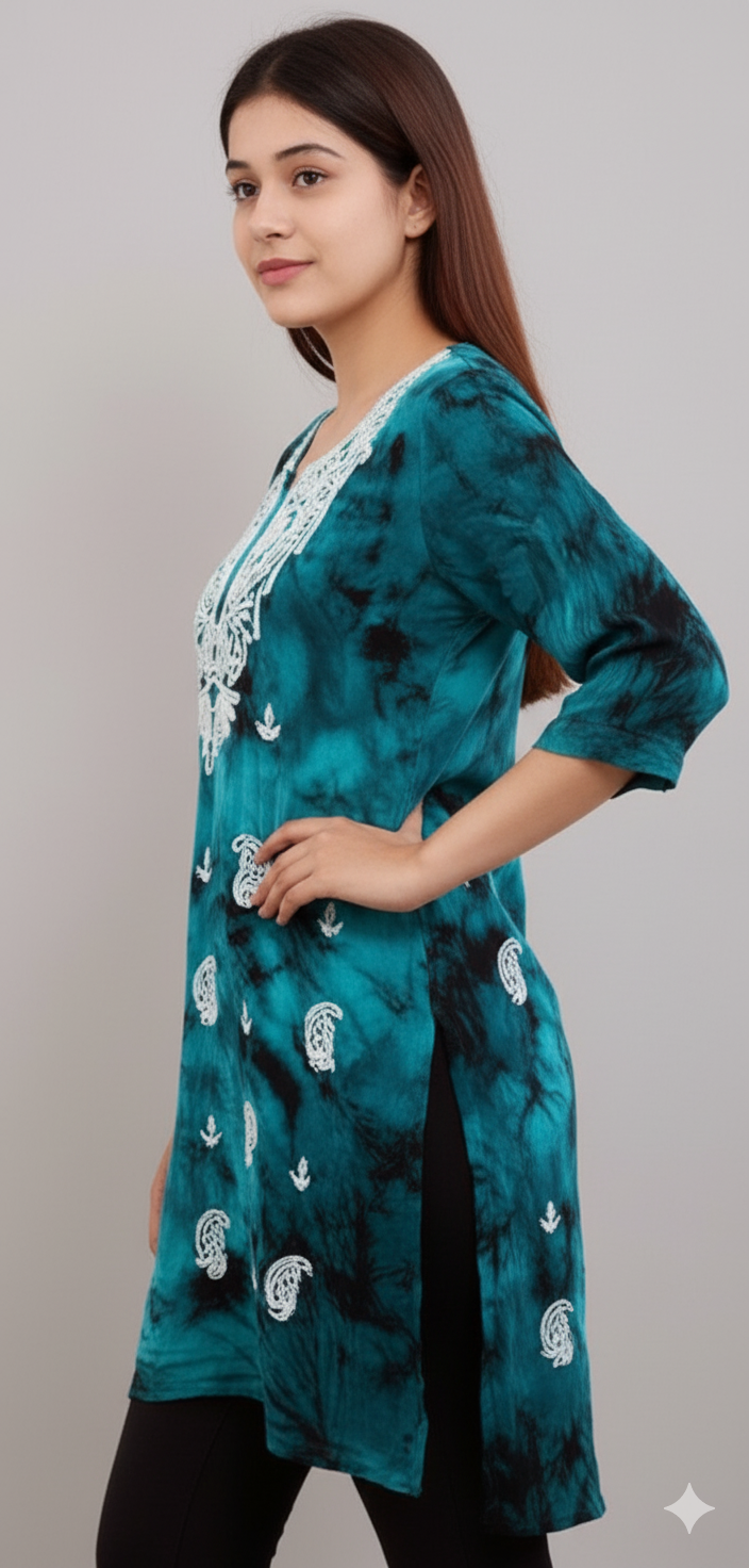 The striking teal blue tie-dye pattern, with hints of black, forms the perfect backdrop for the intricate white embroidery adorning the neckline and scattered paisley motifs across the front. Featuring comfortable 3/4 sleeves and a versatile long cut, this kurti is ideal for various occasions, from casual outings and college wear to festive celebrations. Pair it effortlessly with leggings, palazzos, or jeans to complete your chic and distinctive ensemble.